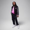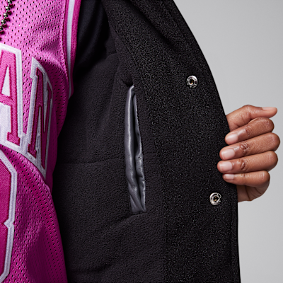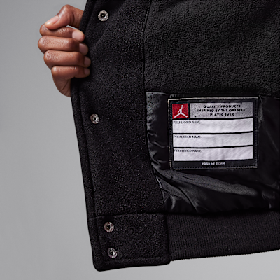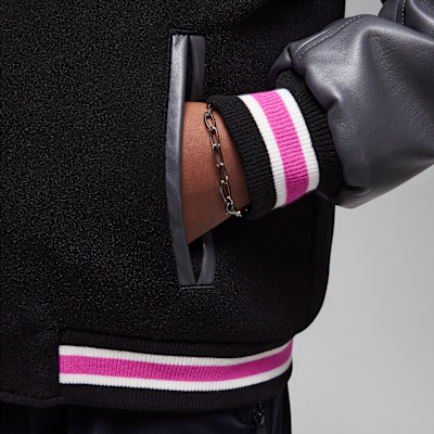 Rep your spot on the Team of Flight with this varsity jacket, which features patch applique detailing. The main body is made of felted poly knit that feels smooth and the sleeves are made of faux leather. It has a roomy cut with a snap-front closure making layering easy. Dropped shoulders create a relaxed fit and pockets at the sides (as well as a handy interior pocket) provide spots to stash small items.