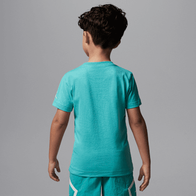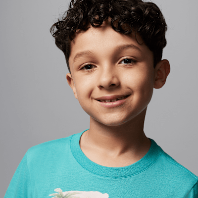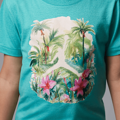 Kids can make a splash in this cotton/poly tee, which features a tropical Jumpman logo printed on a timeless short sleeve silhouette with a tagless crewneck for a comfy feel.