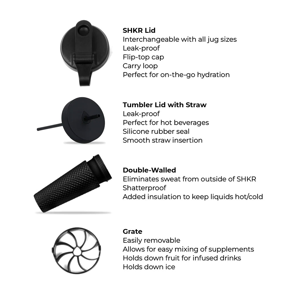 The Studded SHKR holds 24 oz and is double walled to reduce sweat and add insulation for your liquids. This shaker bottle comes with a Pro Lid. Tumbler Lid. and Straw. The included SHKR grate allows you to easily mix supplements into your water. The Studded SHKR is cup holder compatible. has a silicone base to protect your surfaces. and is BPA Free.